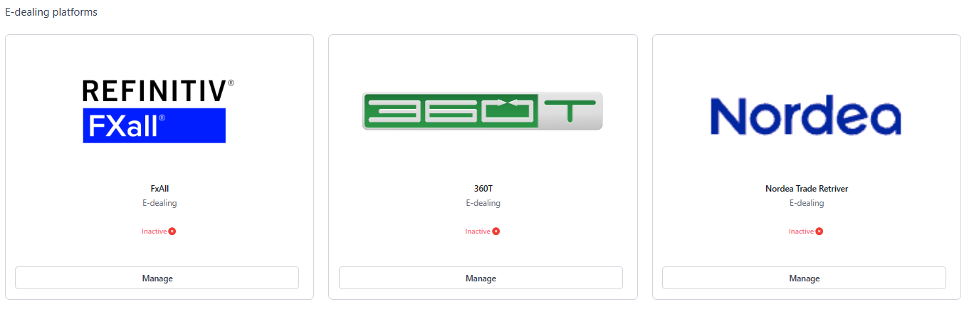 You can create new agreements either manually or by importing them from FX dealing platforms like FxAll, 360T, or Nordea. These platforms are integrated under 'User Profile - Integrations':