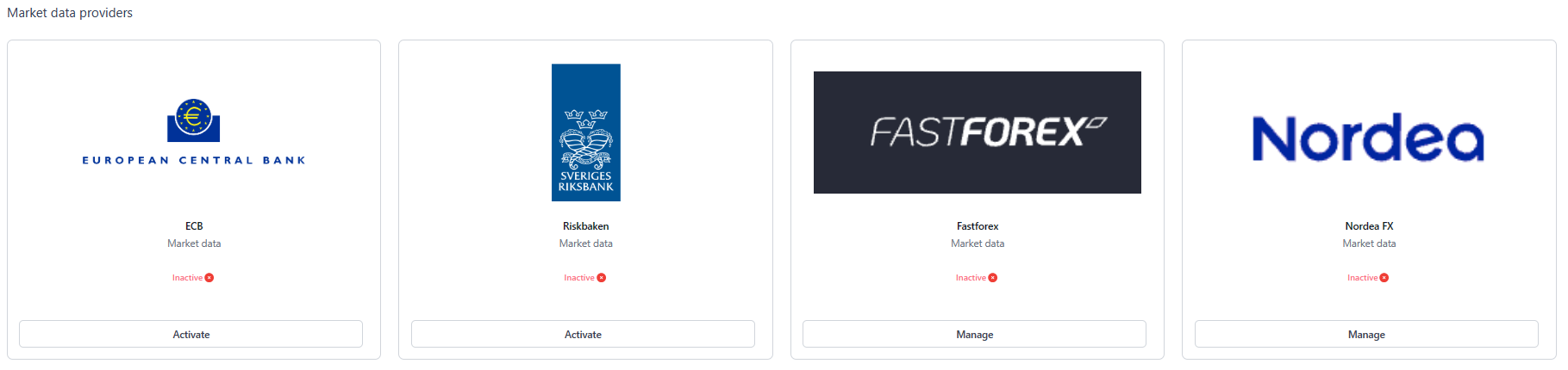 Note: if you want the system to calculate the right valuation (unrealised result) for your forwards and swaps in closing, you need to have - on top of currency fixing rates - forward points in ZenTreasury. You can add them manually, or via a third party rate provider. The integrated providers can be found under User profile - Integrations: