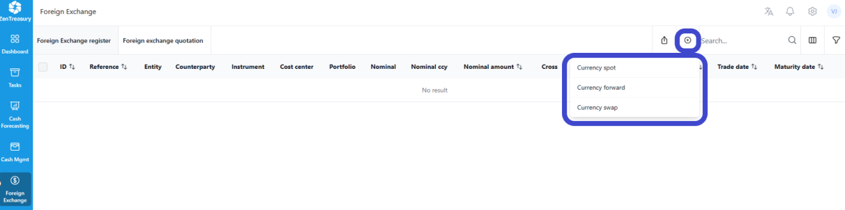 1. Navigate to the Foreign Exchange module and click the '+' icon on the top right.