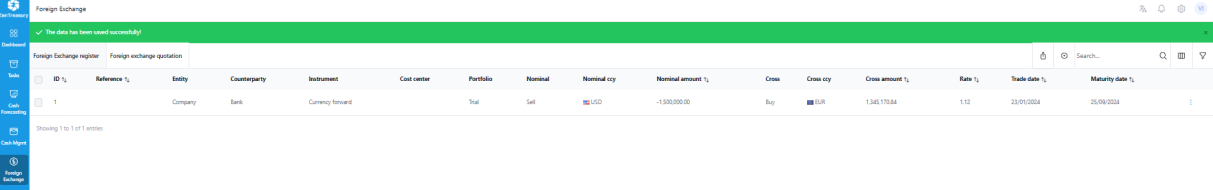17. Click 'Save' when you have added all the needed information for the deal. You will be directed to Foreign Exchange register where you can see all existing FX deals.