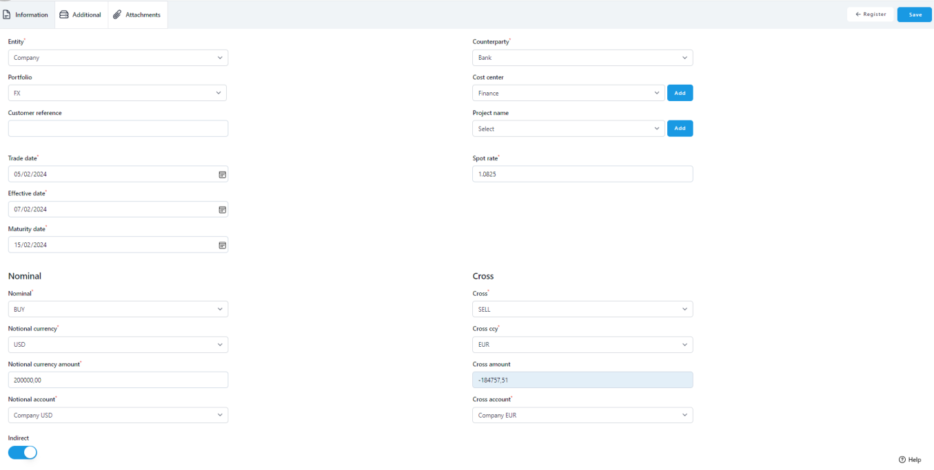 14. The transaction amount will be filled automatically (using Nominal, spot rate, points and forward rate in case of forwards) as well as the value in the cross currency after the cross currency selection has been made.