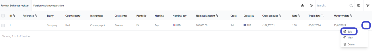 In the Register view, select the FX deal you just created, click the three dots at the end of the deal and select 'Edit'.