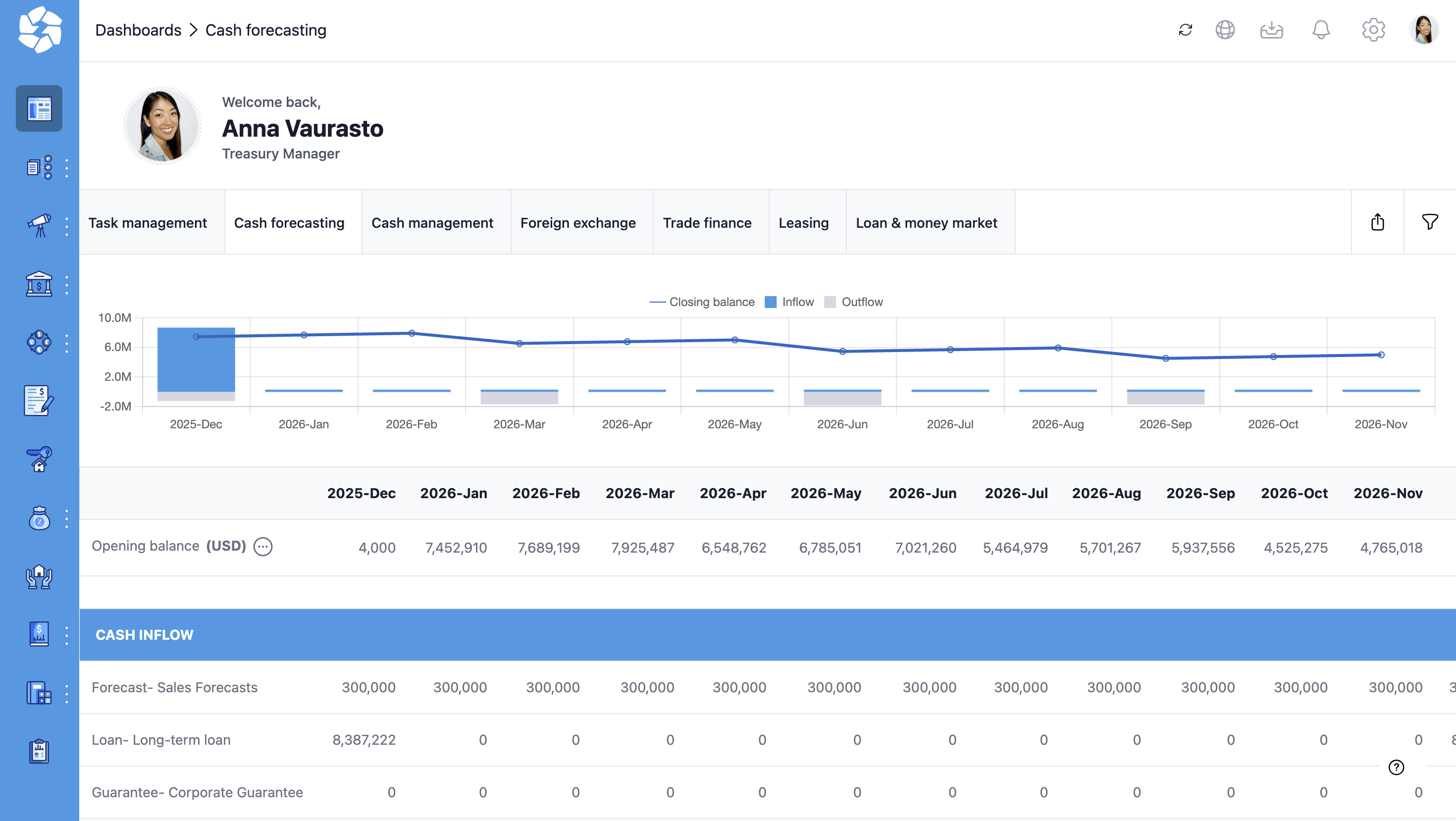 Integrate with Open Banking APIs and keep group-wide records of bank accounts, credit cards and other cash related items. Cash Management dashboard view summarises all available cash balances, overdraft limits and their utilisation providing a view on company’s cash position at a glance.