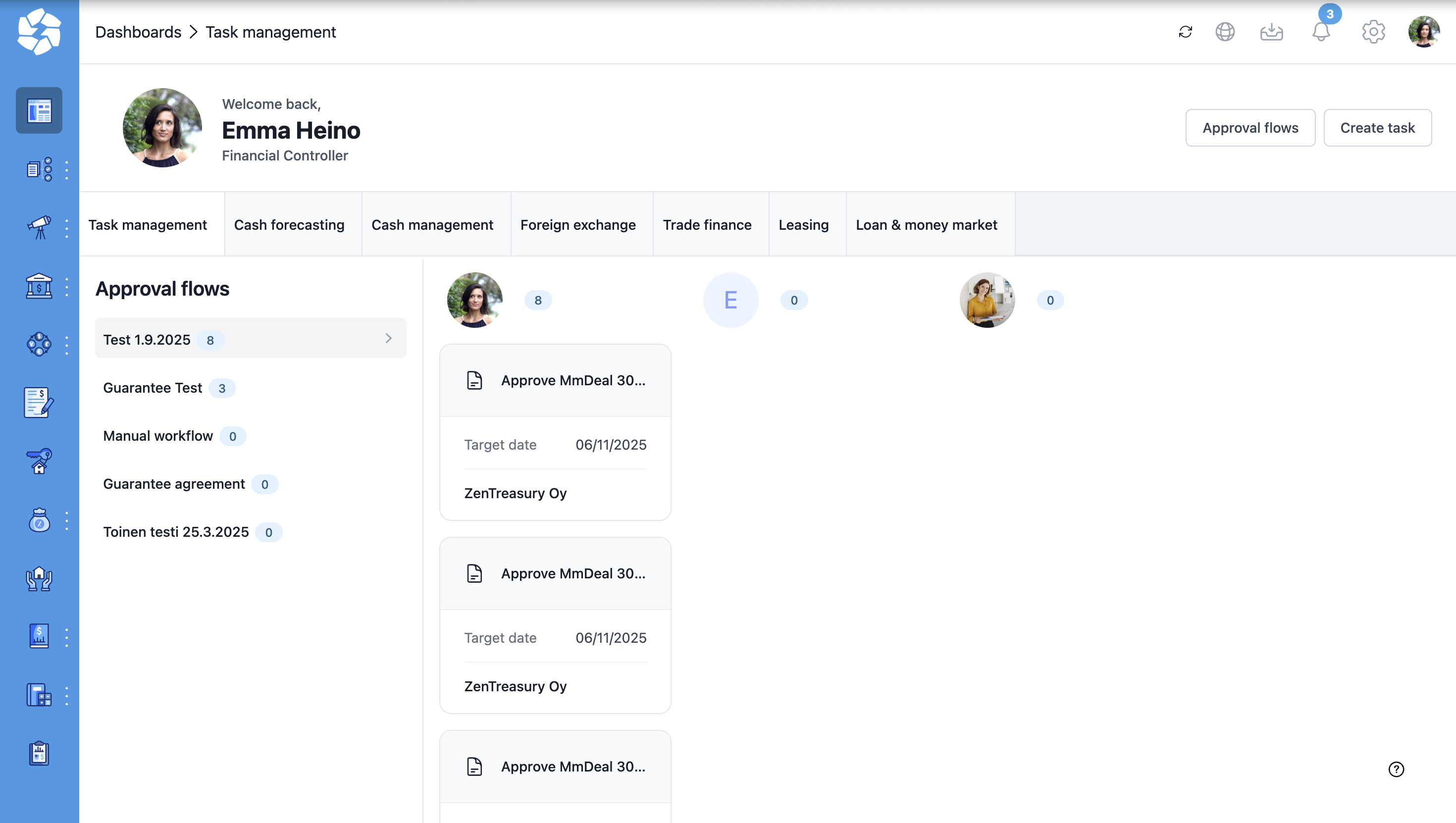 In Approval Flows you dashboard you can see all pending tasks regarding the defined approval flows of the company and the status of the tasks in question.