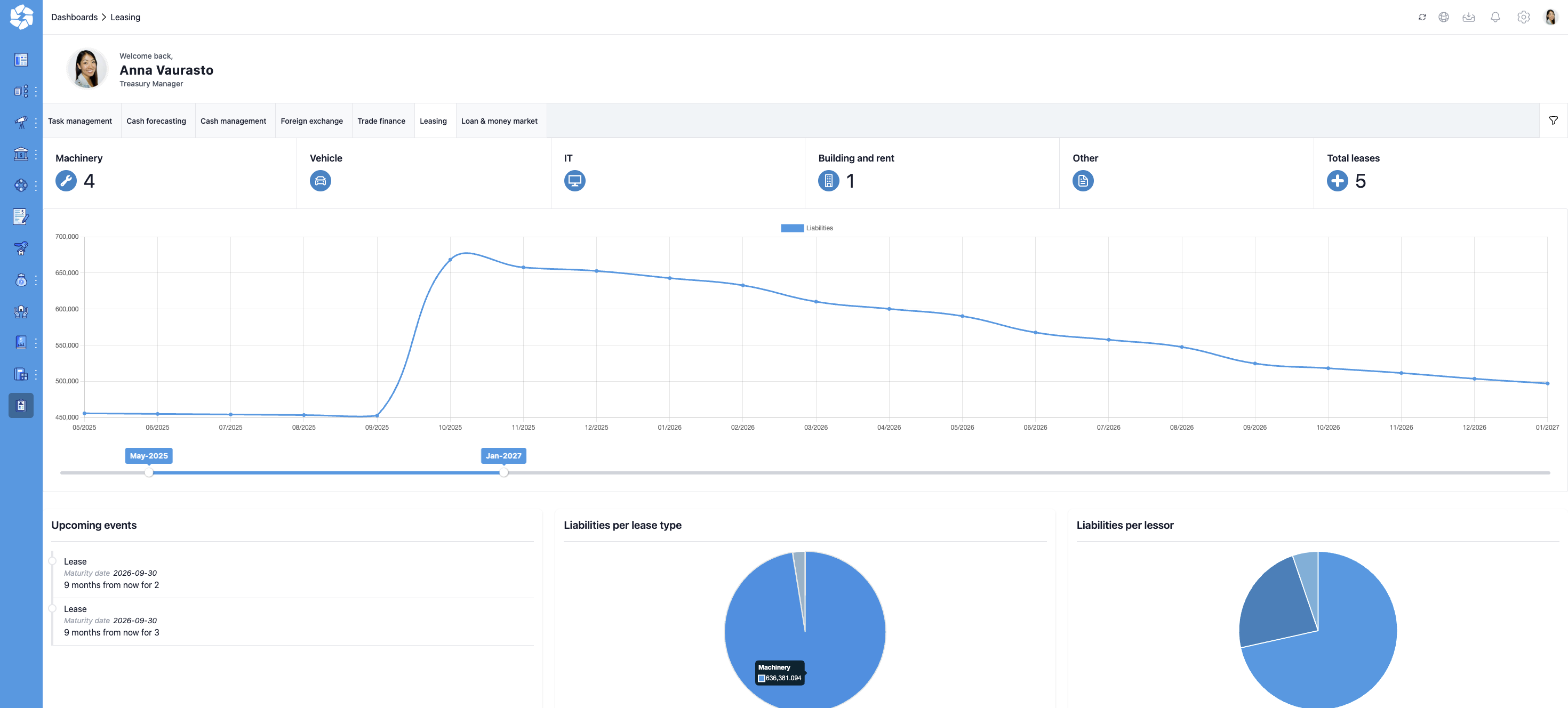 The Leasing dashboard provides a clear overview of lease liabilities, asset categories, and upcoming lease events in one view. It visualizes how lease liabilities evolve over time and breaks them down by lease type and lessor to support forecasting, compliance, and informed decision-making