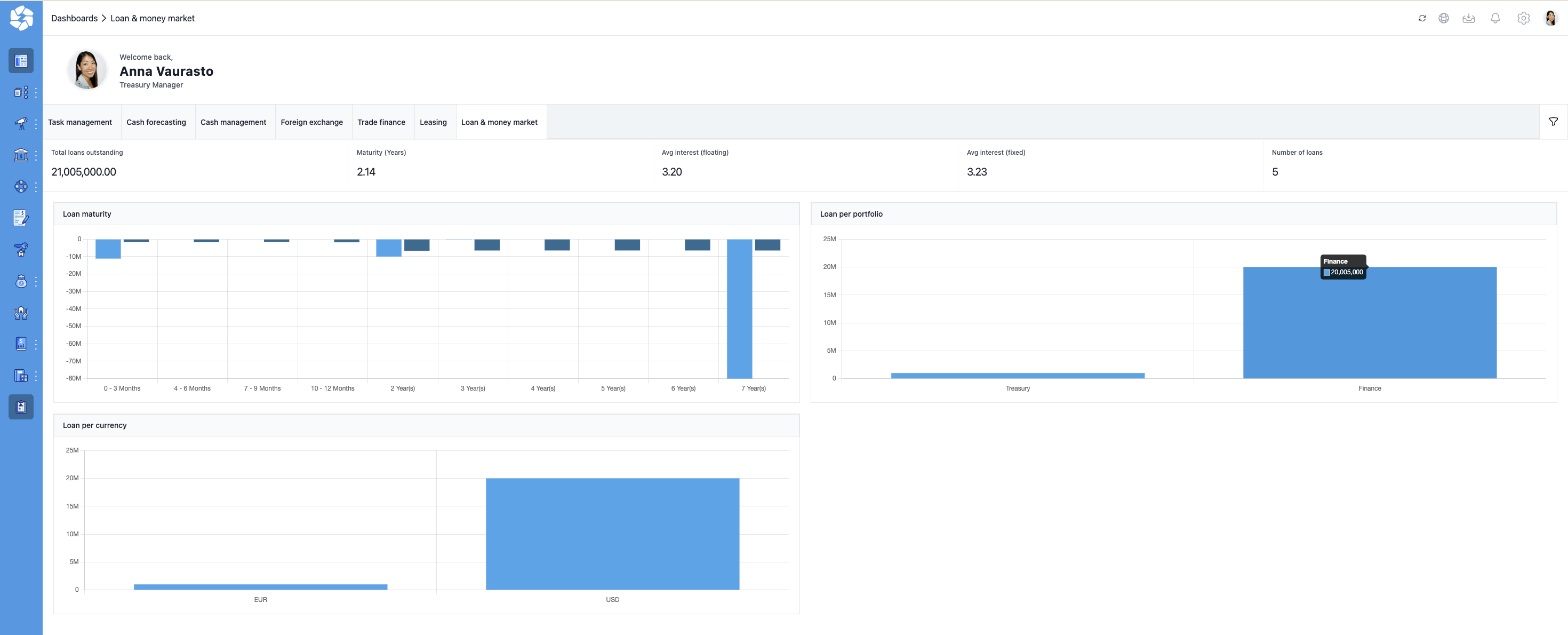 Manage group’s internal and external loans and other interest rate products. Get an instant view on total outstanding loans, maturities and average interests from this dashboard.