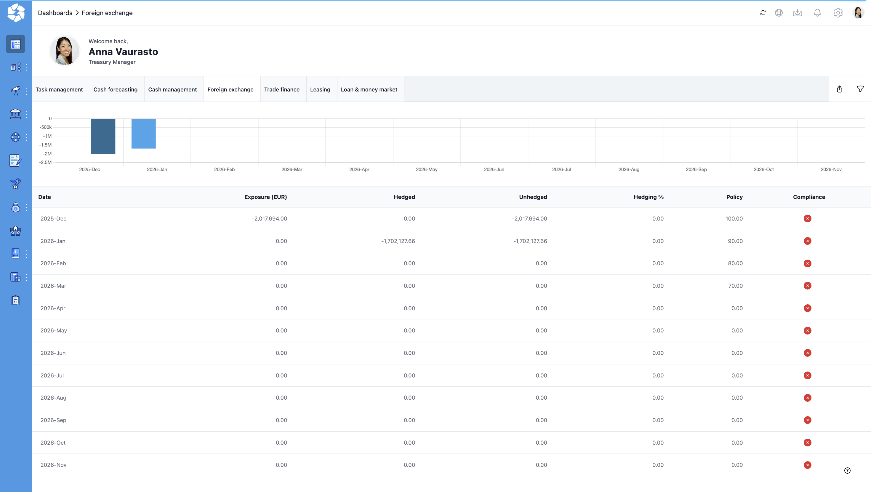 Hedging of internal and external currency positions. Supported instruments include spots, forwards, swaps and FX quotes. If hedging policy parameters are predefined in the system, hedging percentage and policy compliance are shown on the dashboard.