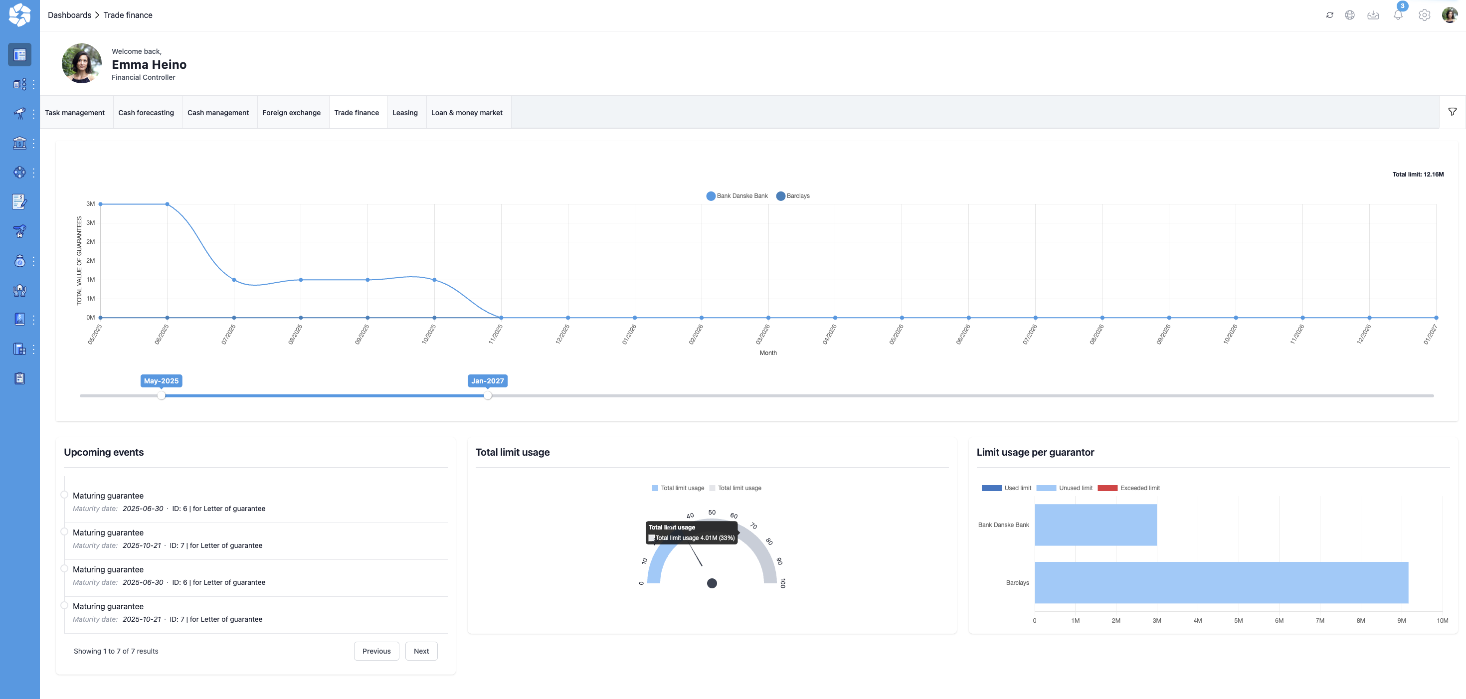The Trade Finance dashboard provides a real-time overview of guarantees and trade finance limits, showing how total exposure evolves over time. It highlights upcoming guarantee maturities and breaks down limit usage by guarantor to support risk monitoring and proactive limit management.