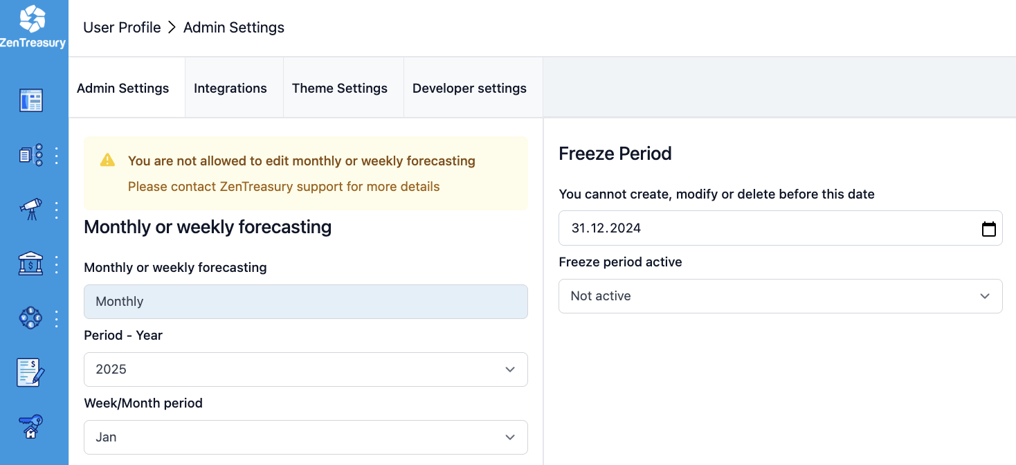 Select whether the company does forecasting weekly or monthly. Select the forecasting year and the Week/Month period, either the week number or the month in question. Note that admin user has to change the forecasting week/month every time when the new forecasting period starts. It is only possible for users to input forecasts for the period selected in the admin settings.