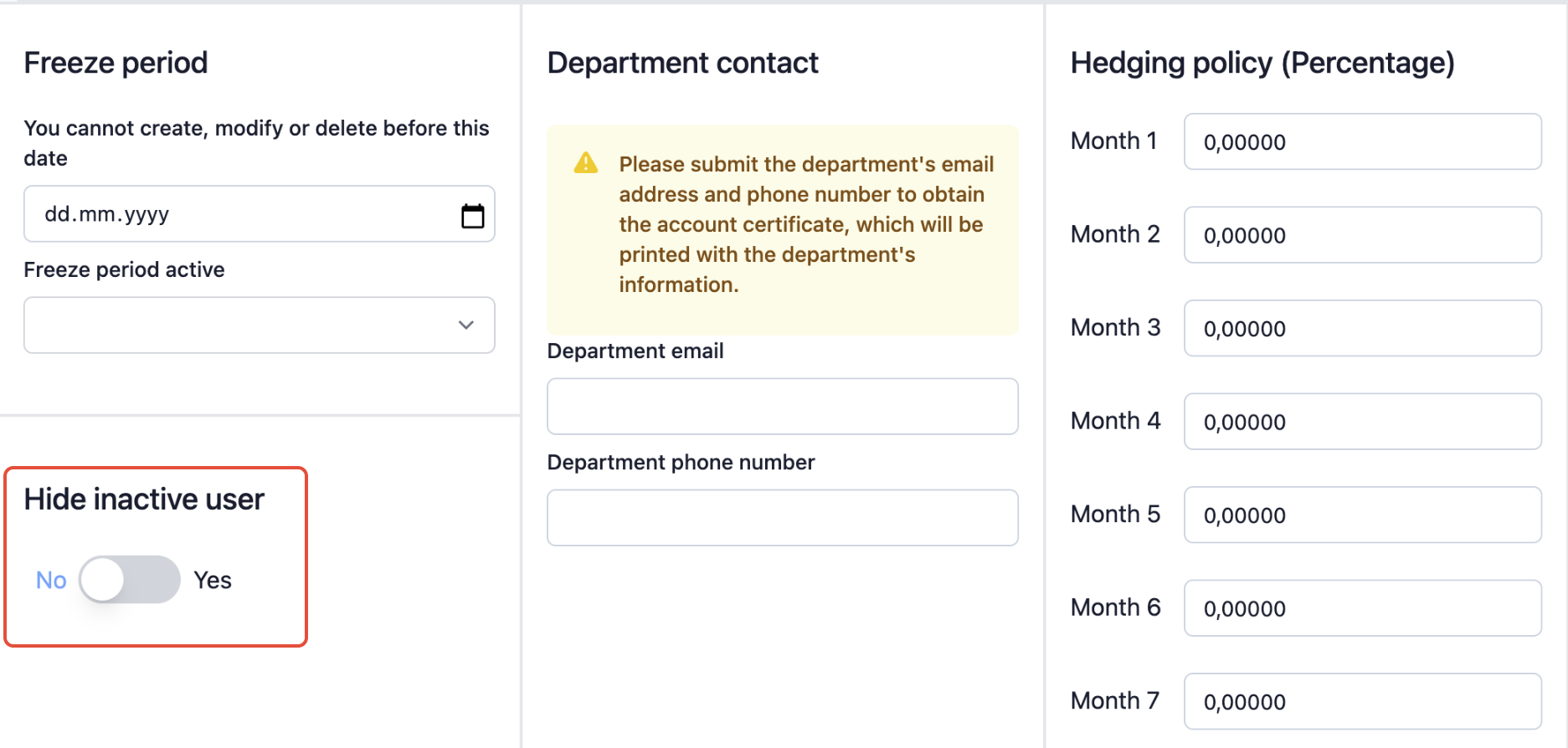 You cannot create, modify or delete before the selected date. All agreements created before or on selected date will be locked depending on the “Freeze period active” mode. Creating new agreements before this date is not possible.