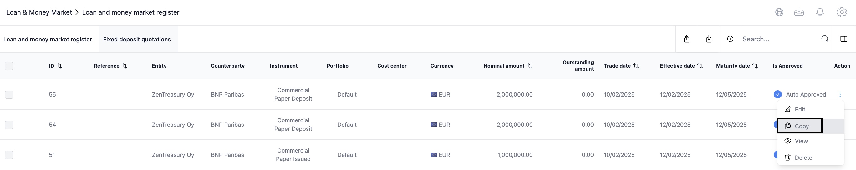 When you copy a commercial paper agreement, system copies the underlying agreement information including the cash flows. Therefore, you only have to select 'save' and the copy will appear on your register.