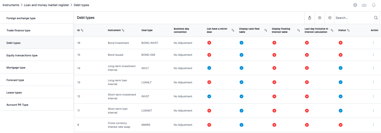 First, you must have created a relevant Entity, Counterparty, Portfolio, Cost Center, Bank Accounts and loan instrument types to proceed with creating a loan agreement. Debt instrument type with LOAN or INV name start defines whether you’re borrowing or lending.