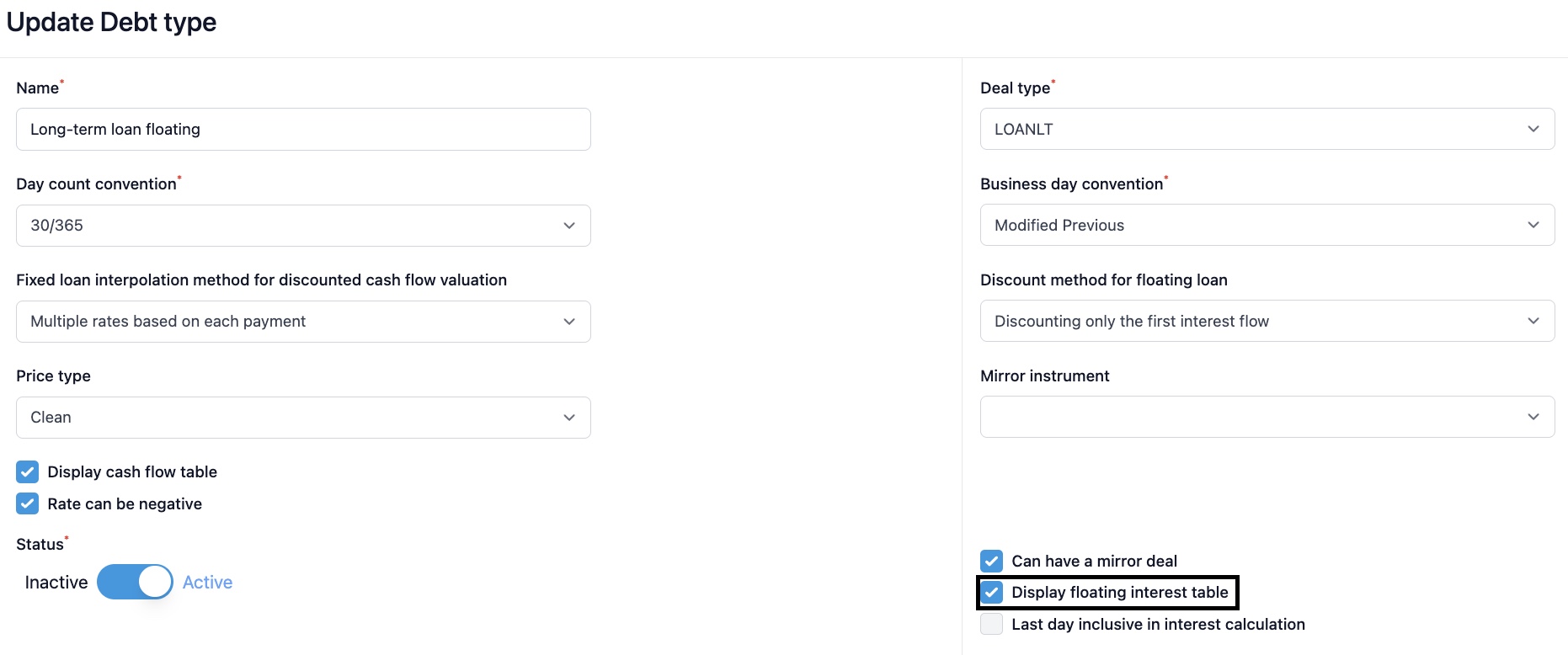 Loan types can be added, modified and activated/deactivated from Settings -> Instruments -> Debt types.