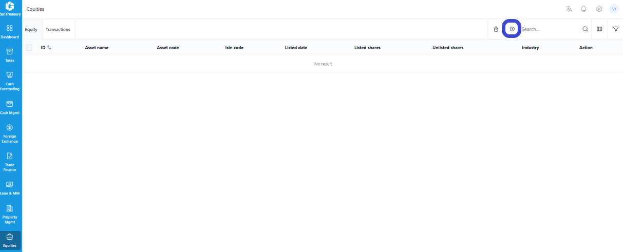 To add a new equity to the register, click the '+' icon located at the top right of the page.