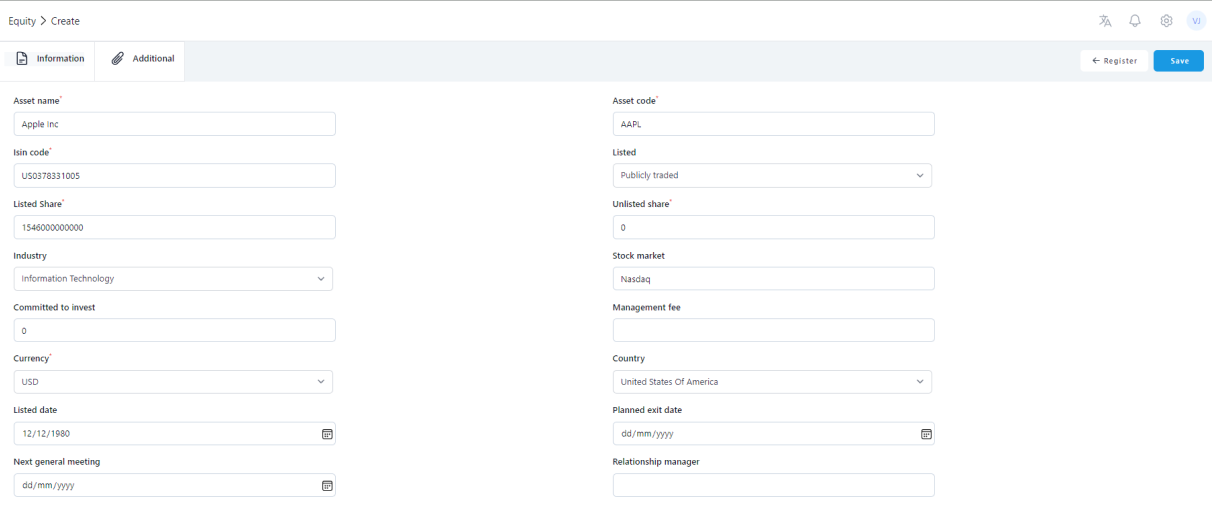 When adding an equity, it is mandatory to specify the quantity of both listed and unlisted shares. This information is crucial for saving the entry correctly. Fill in the required information and click 'Save' to add the equity to the register.