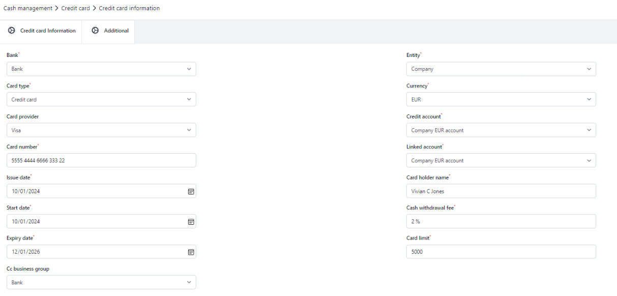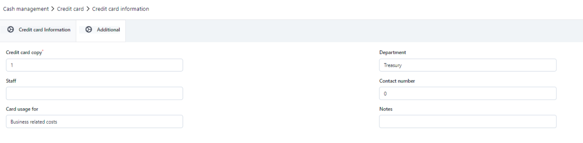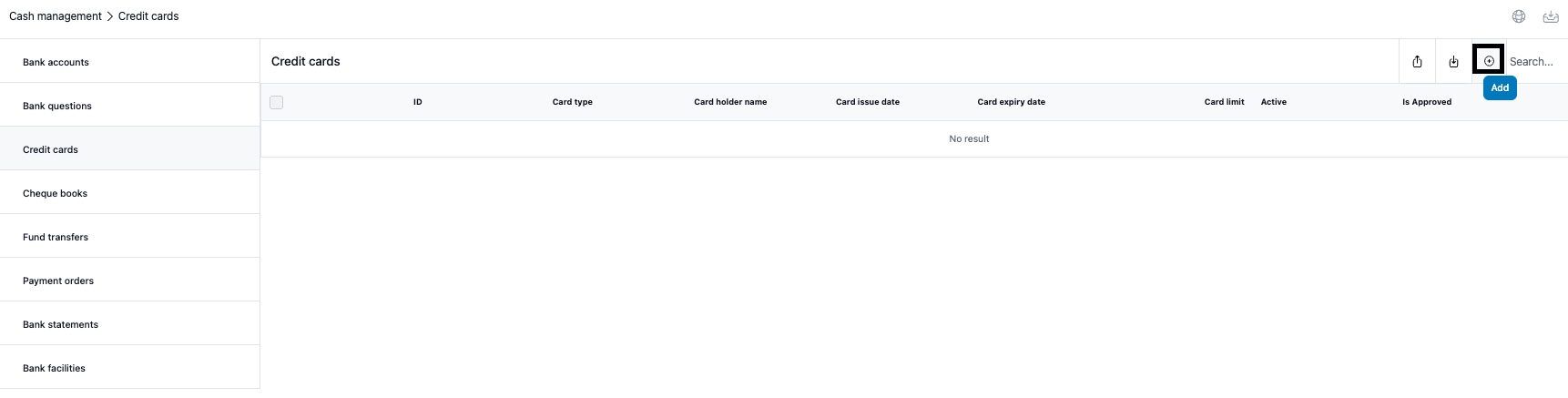 To add a company credit card, go to Cash Management module and from there to Credit card tab. Click the + icon on the top right.