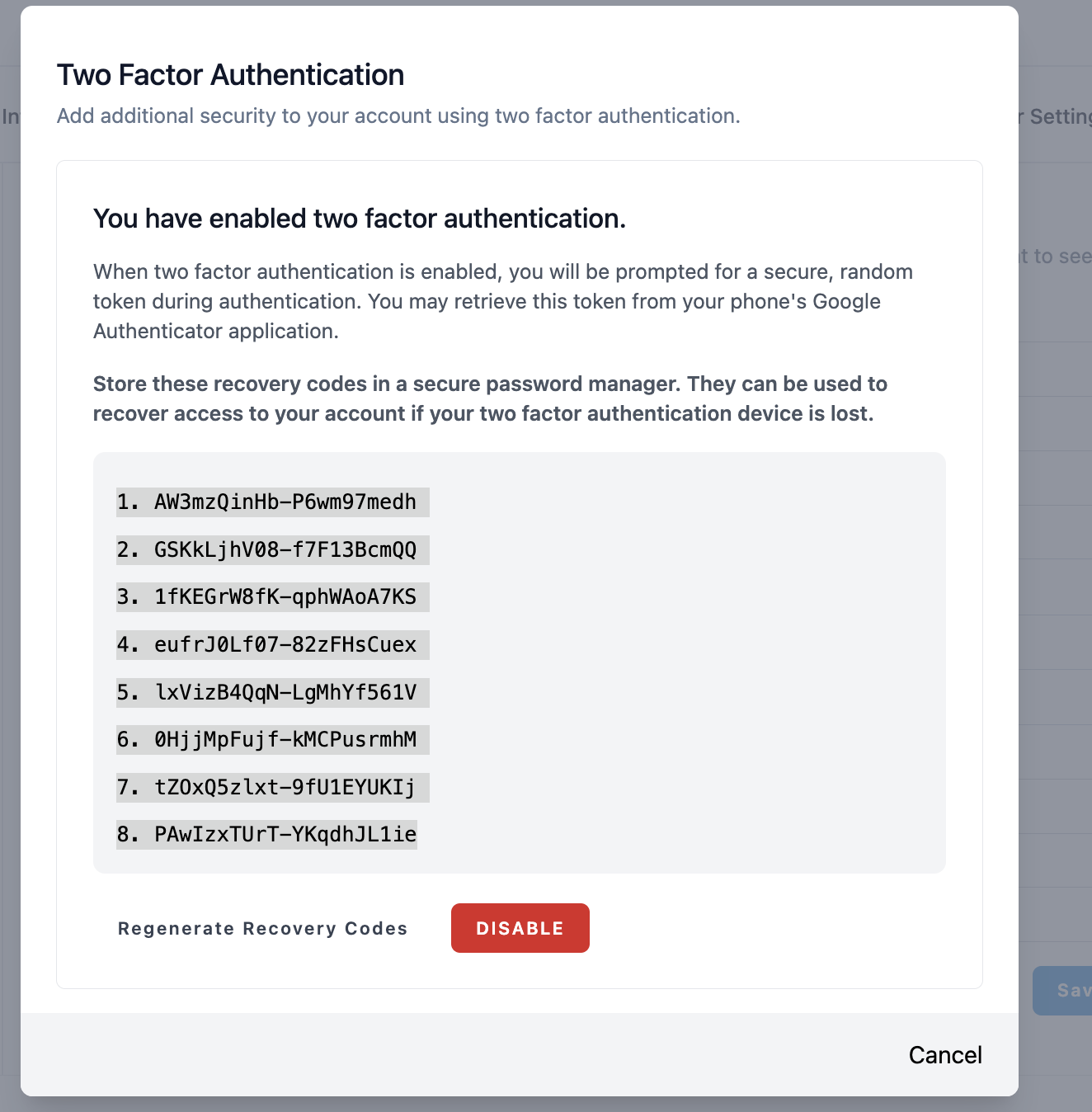 - You can choose to Regenerate recovery codes at any time.