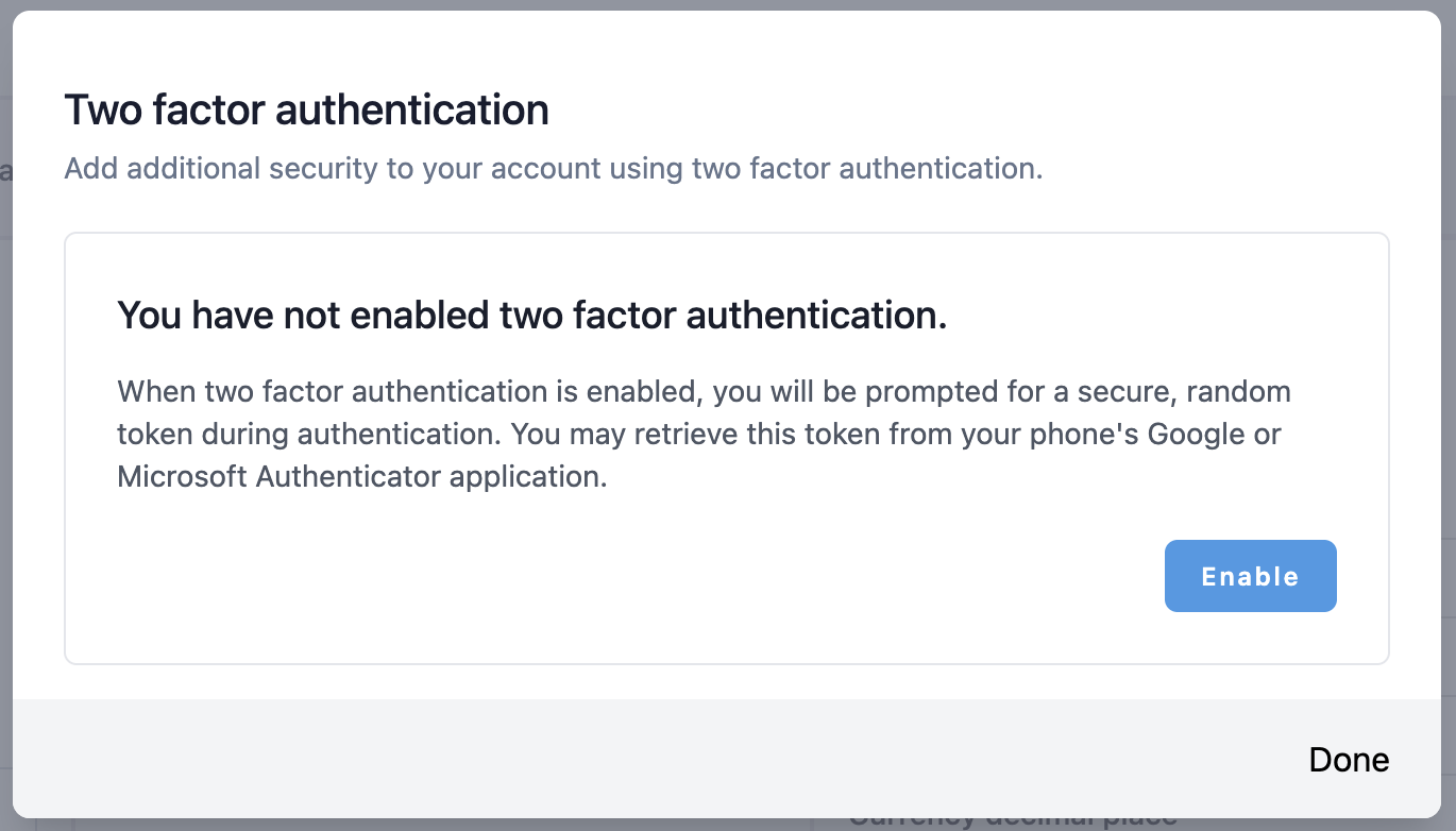 - Click Enable Two Factor Authentication.