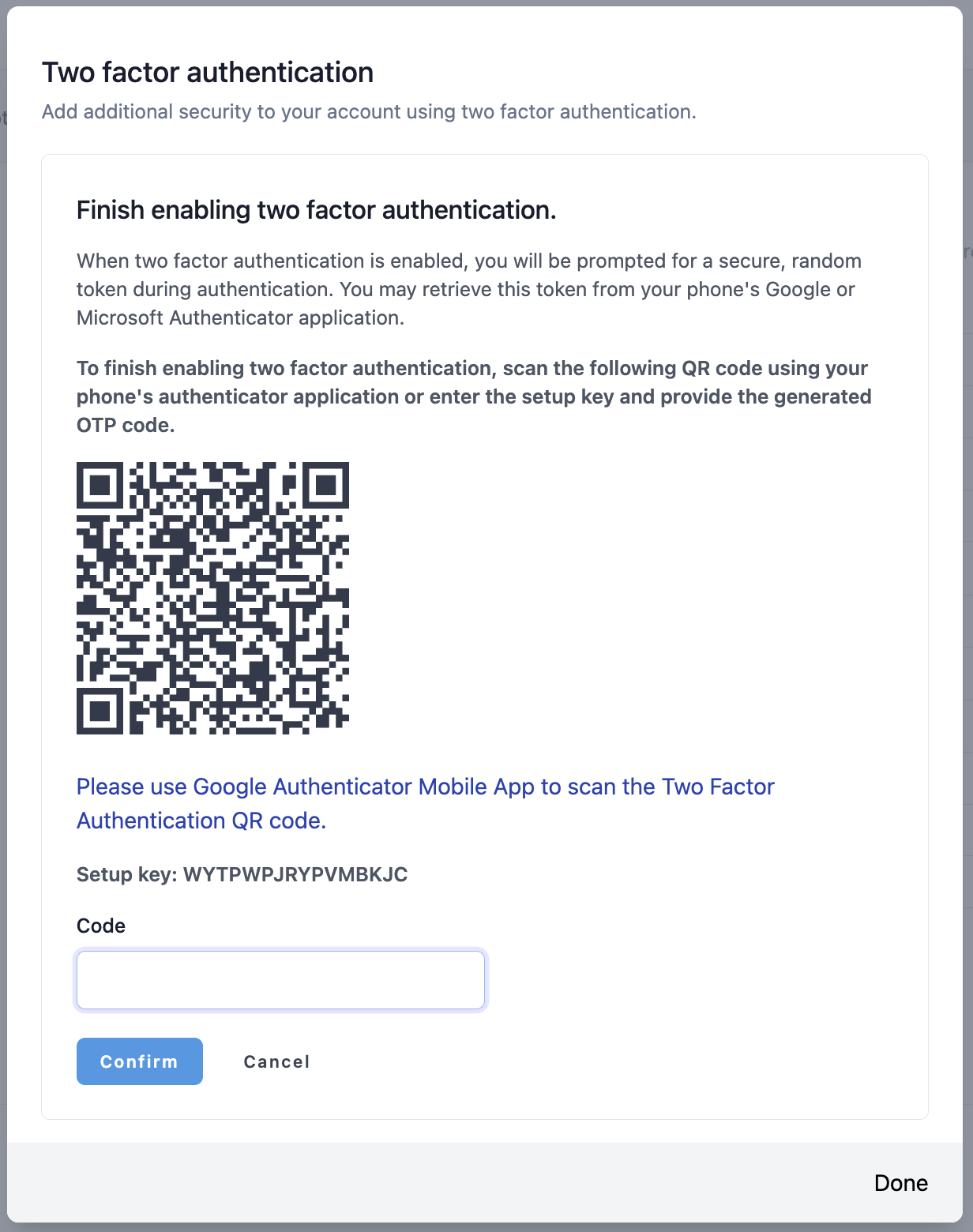 Once you're in the Two Factor Authentication modal: