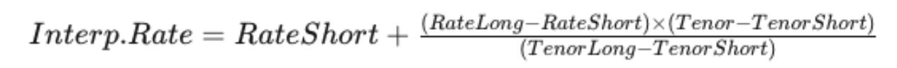 This formula is used to interpolate forward foreign exchange (FX) rates when a specific Tenor point is not directly observable on the yield curve. It calculates an estimated forward rate (Interp.Rate) by adjusting the shorter-term rate (RateShort) with a proportion of the diBerence between the longer-term rate (RateLong) and RateShort, scaled by the relative distance between the Tenor, TenorShort, and TenorLong.
