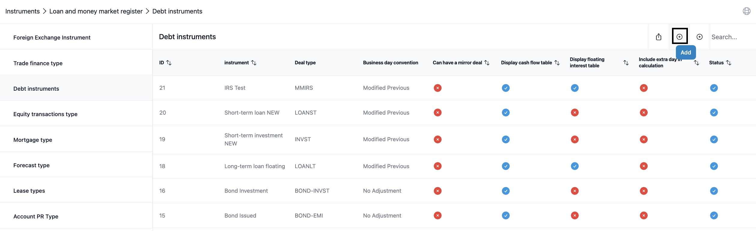 Selecting Debt instruments from the list and choosing "add" from the plus icon you can proceed to adding a debt instrument type.
