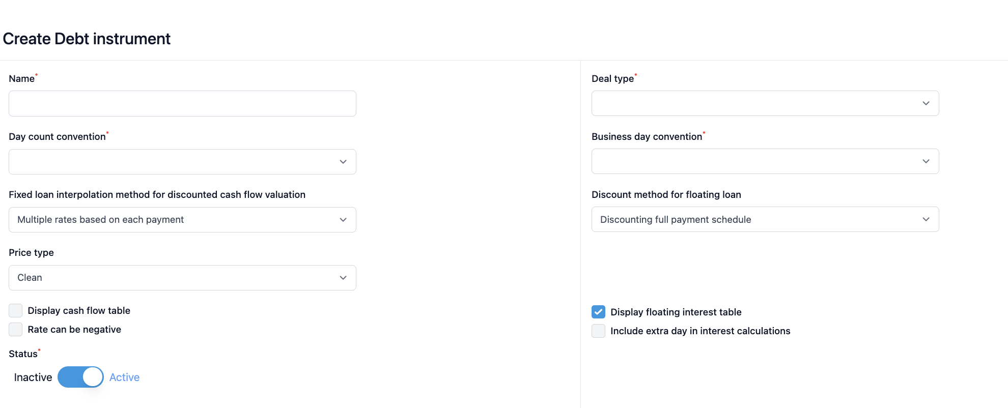 Deal Type: This selection determines the specific calculation method for your debt instrument. Options determine for example if the deal is a loan/deposit or emission/investment according to the deal in question.