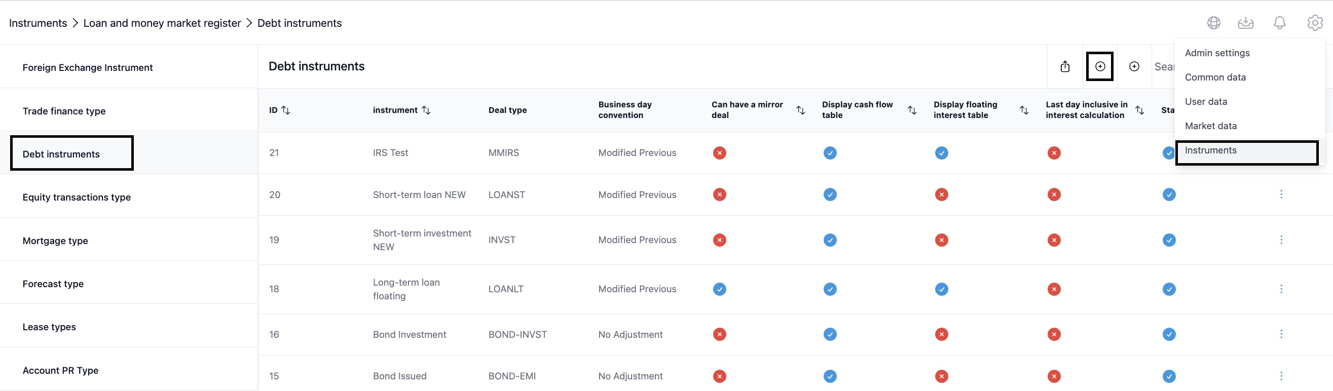 In order to edit, copy or delete an instrument type, you can navigate to the three dots at the end of the row and activate your selection. You can add debt instrument types from Settings -> Instruments -> Debt types by choosing + sign on the top right corner.