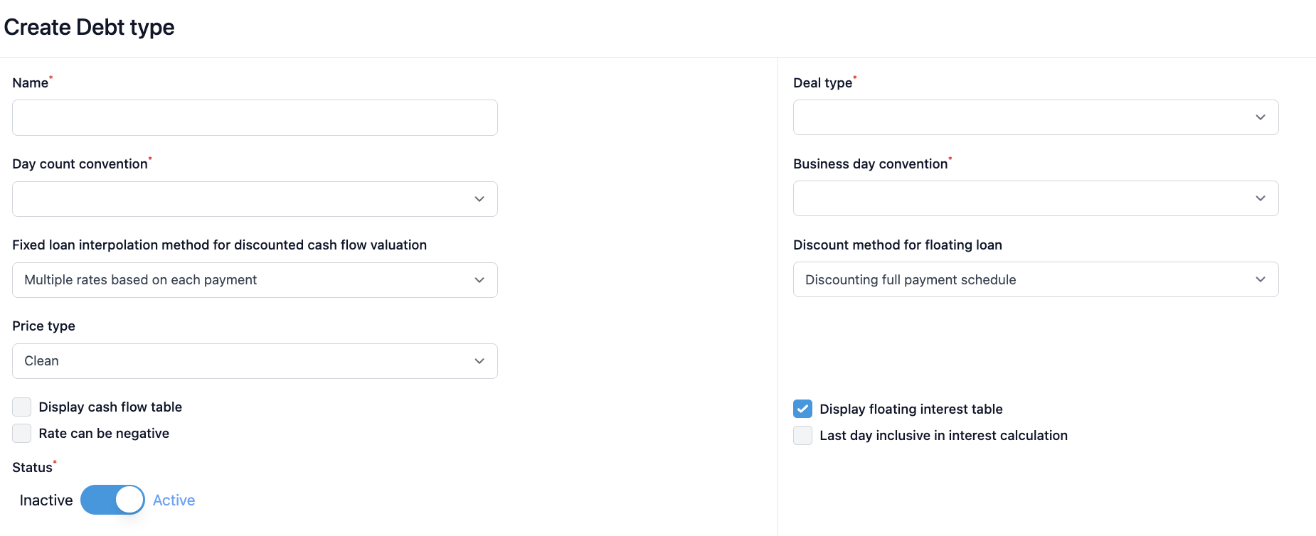 A form to create a debt type will open. Fill in the mandatory fields marked with red star and make a selection for the optional fields as you wish.