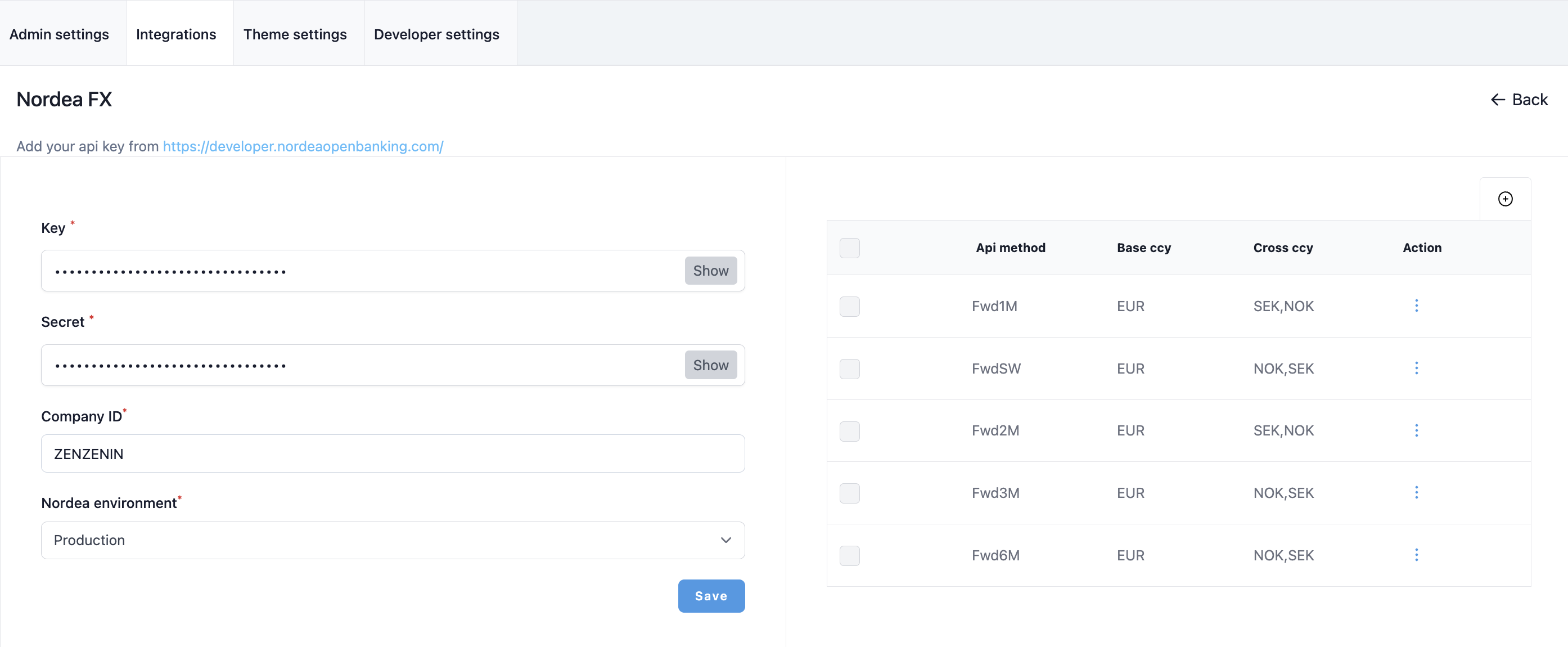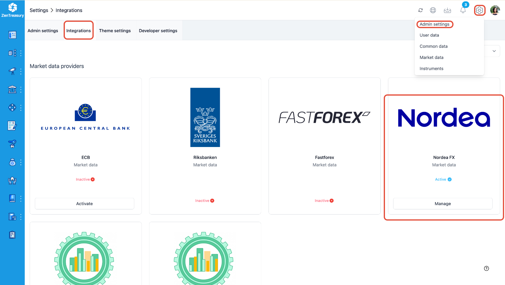 Navigate to Settings > Admin settings > Integrations > Market data providers > Nordea FX