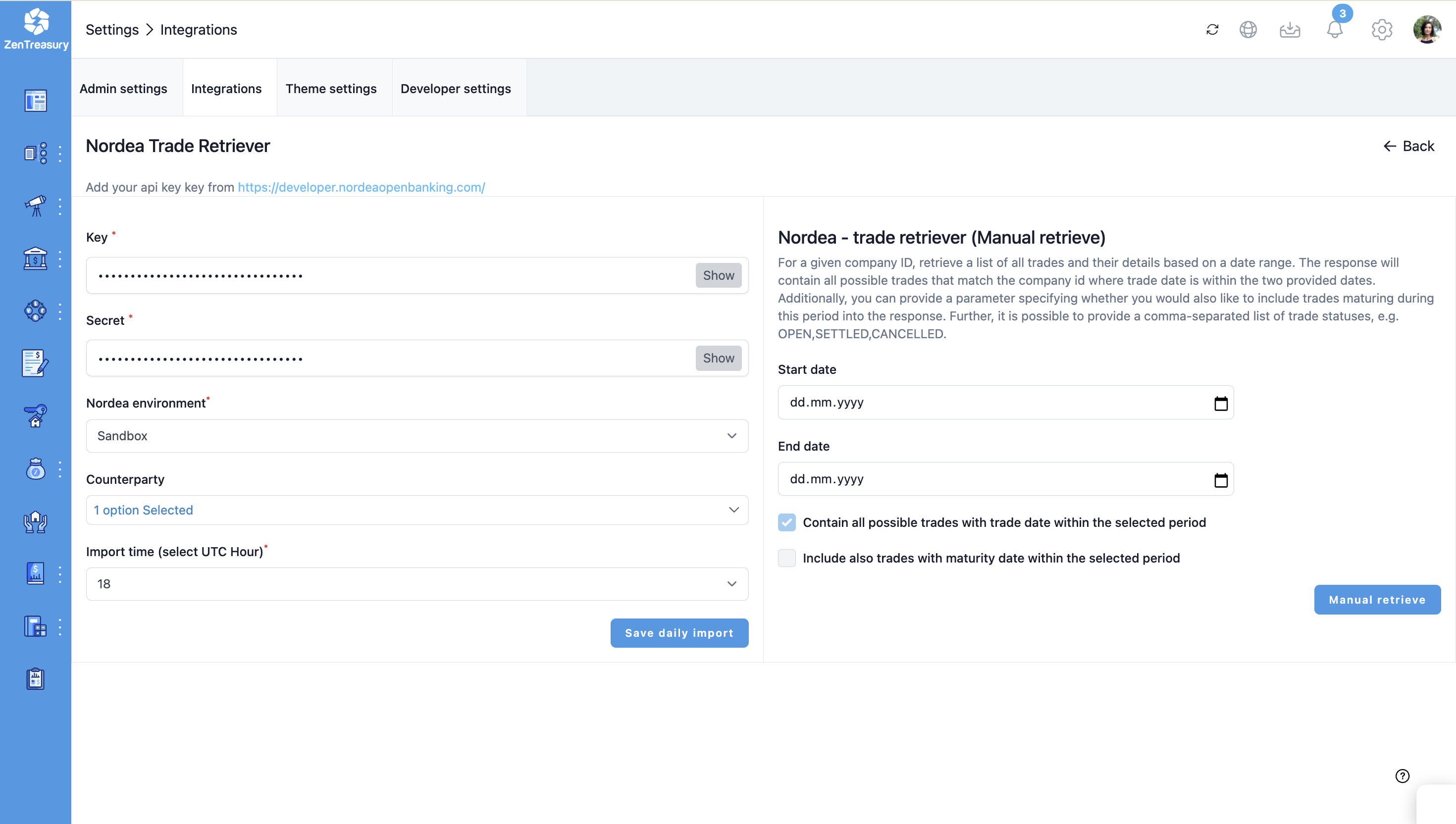 Navigate to Settings > Admin settings > Integrations > E-dealing platforms > Nordea Trade Retriever