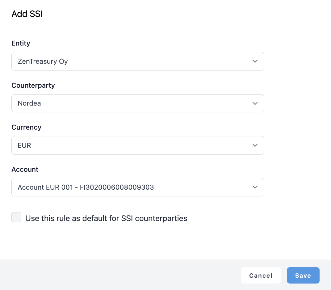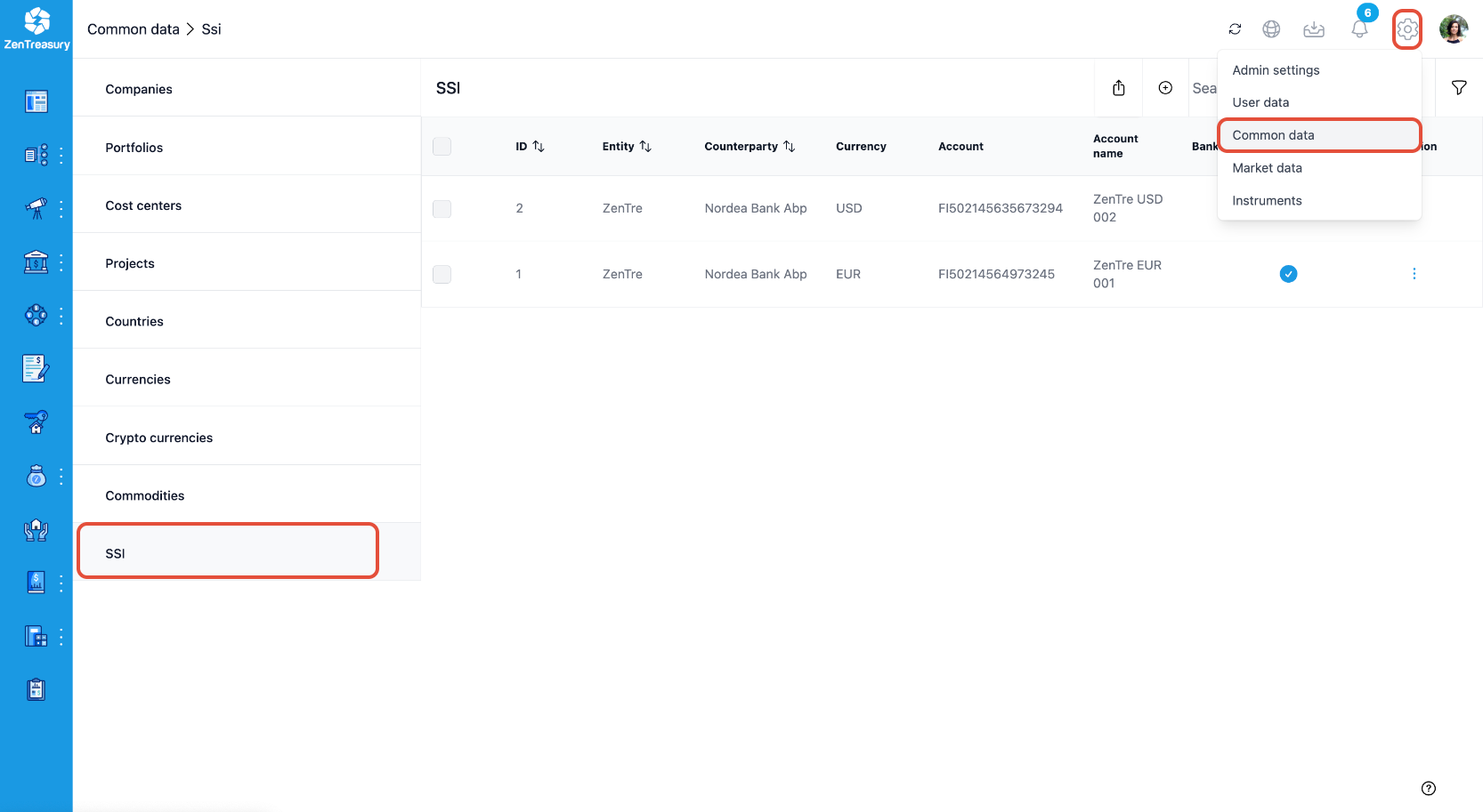 Entity column —> For each entity under whose name trades have been made, SSI (Standard Settlement Instructions) must be created. That means: if a trade is made in a certain currency, to which account should it be directed. Click ''Save'' to save the information.
